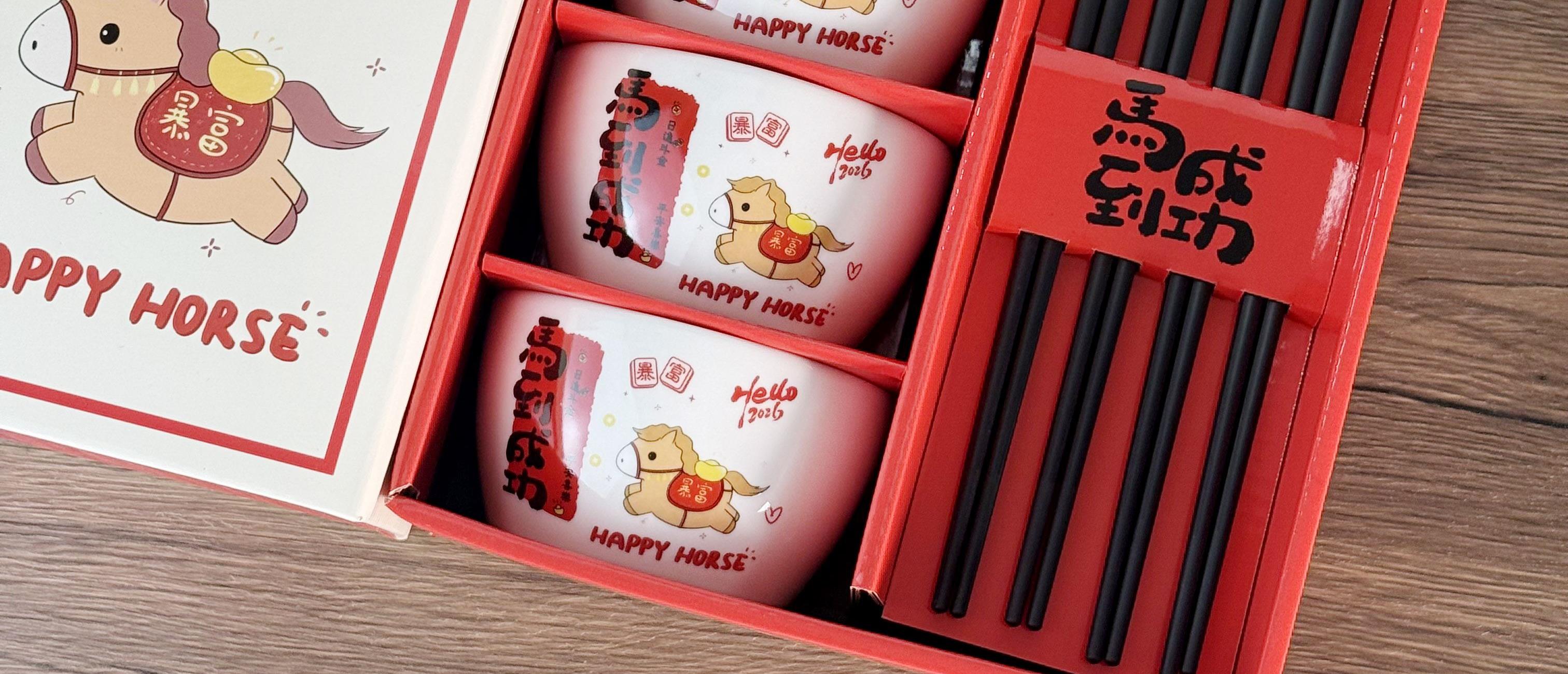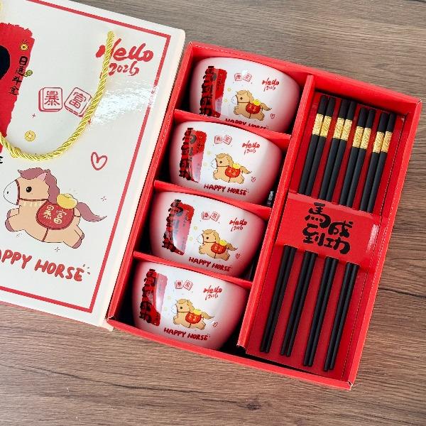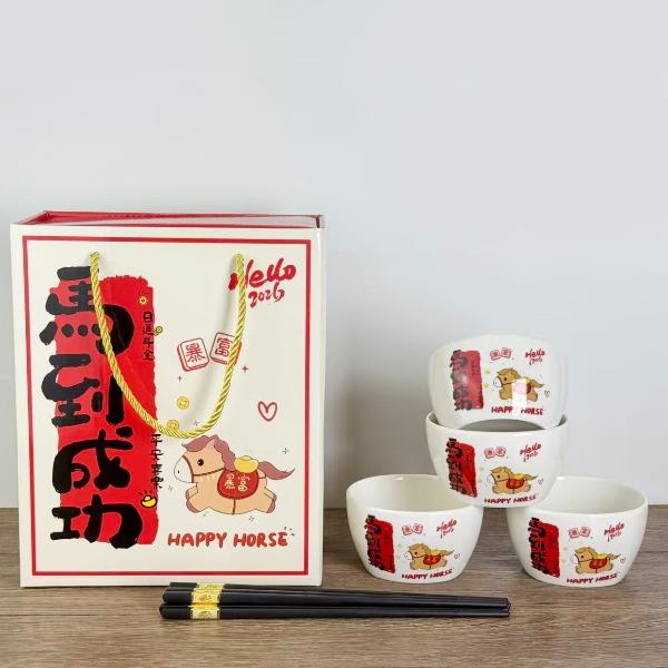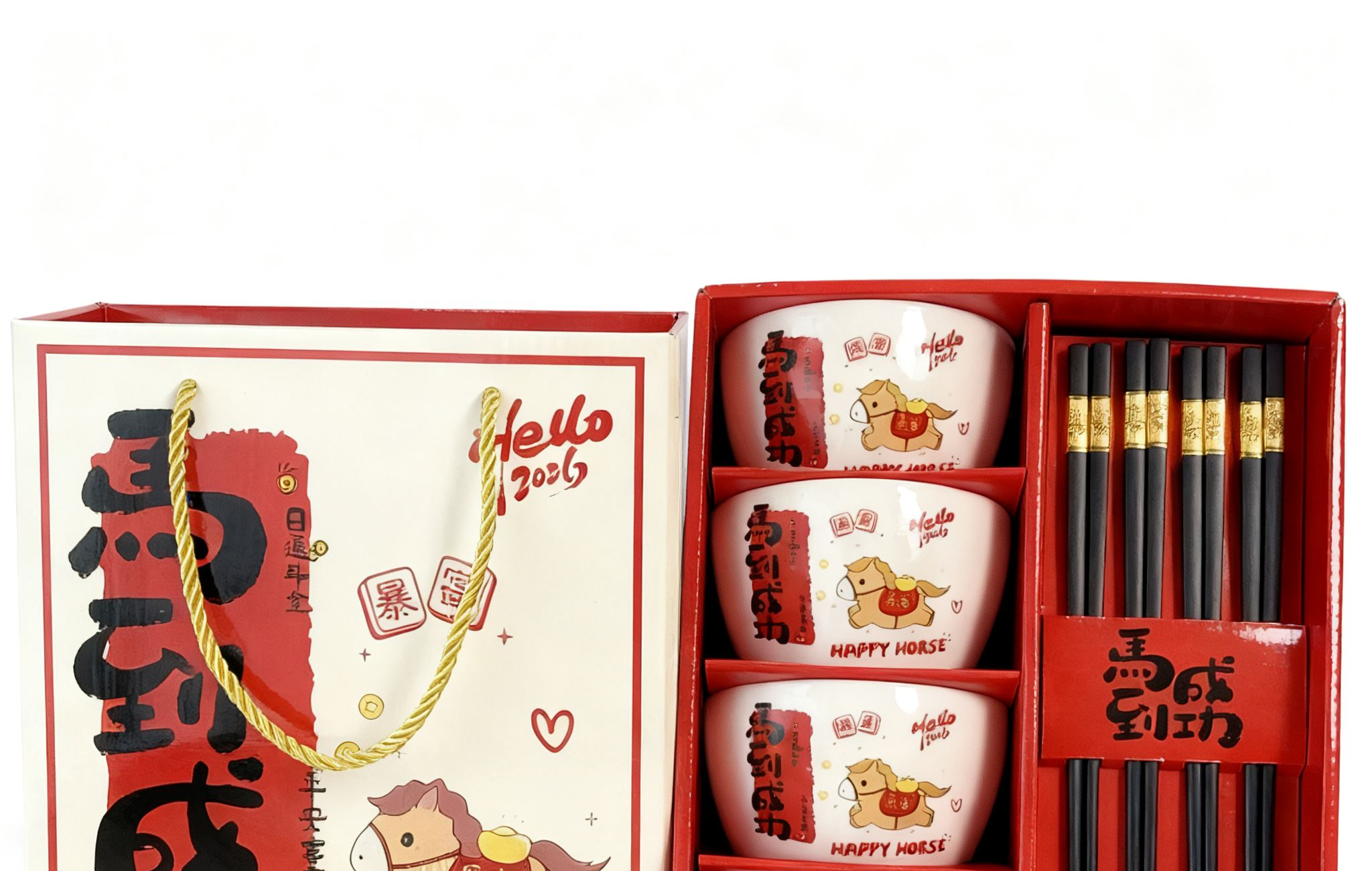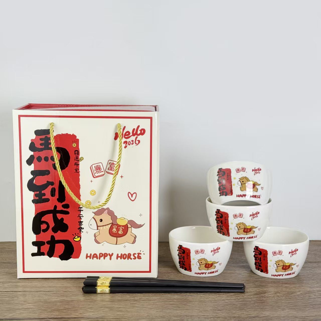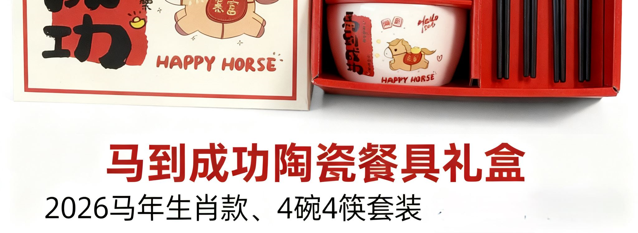 礼盒尺寸:24*13*27cm 箱 规:0.154立方 重量26.6KG 外箱尺寸: 62*45*55CM 配 法:4个4.5寸碗+4双筷子 1.2kg 材 质:新骨瓷+密胺金属筷 包装方式:礼盒包装 🔥2025要“马到成功”?这套餐具必须安排!谁能拒绝这么萌的生肖马餐具啊🐎 “马到成功”+“暴富平安”的祝福直接刻在碗上,4碗4筷的配置,自己用讨个好彩头,送朋友更是心意满满~红礼盒一拎,颜值仪式感全拉满!新的一年,就让每一餐都吃出自带好运的快乐✨